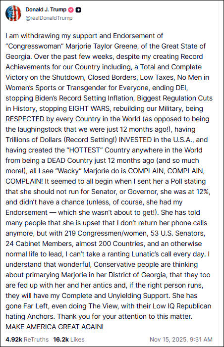 “我正撤回对众议员玛乔丽·泰勒·格林的支持和背书。”他补充说,格林正在竞选2026年连任,但她已经“走向极左”。