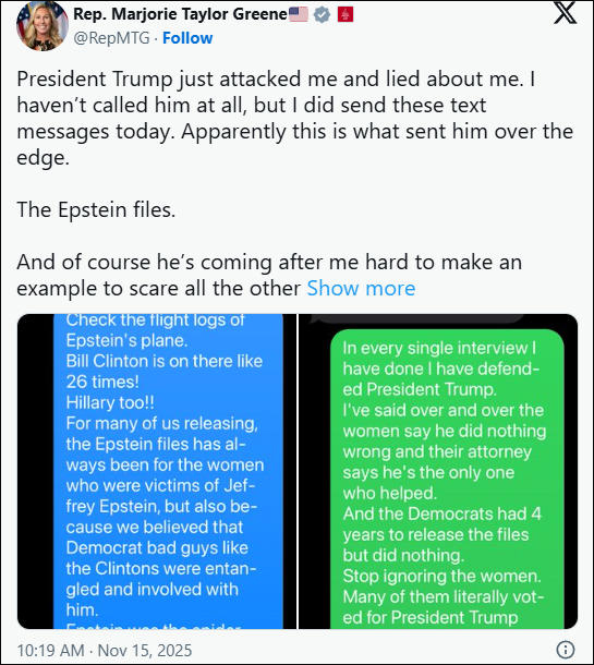 “他之所以这么猛烈地攻击我,当然是拿我杀鸡儆猴,在下周投票决定是否公开爱泼斯坦文件之前,吓唬其他所有共和党人。”